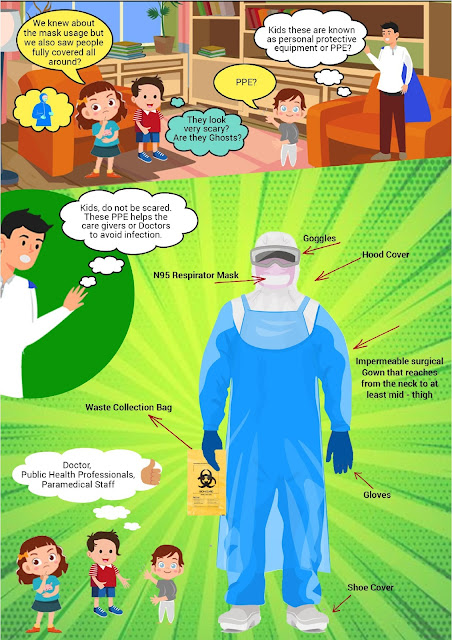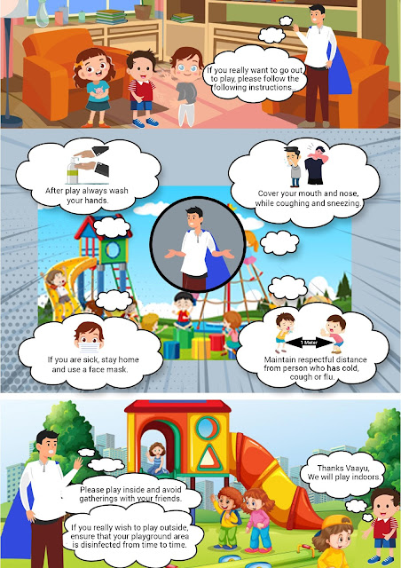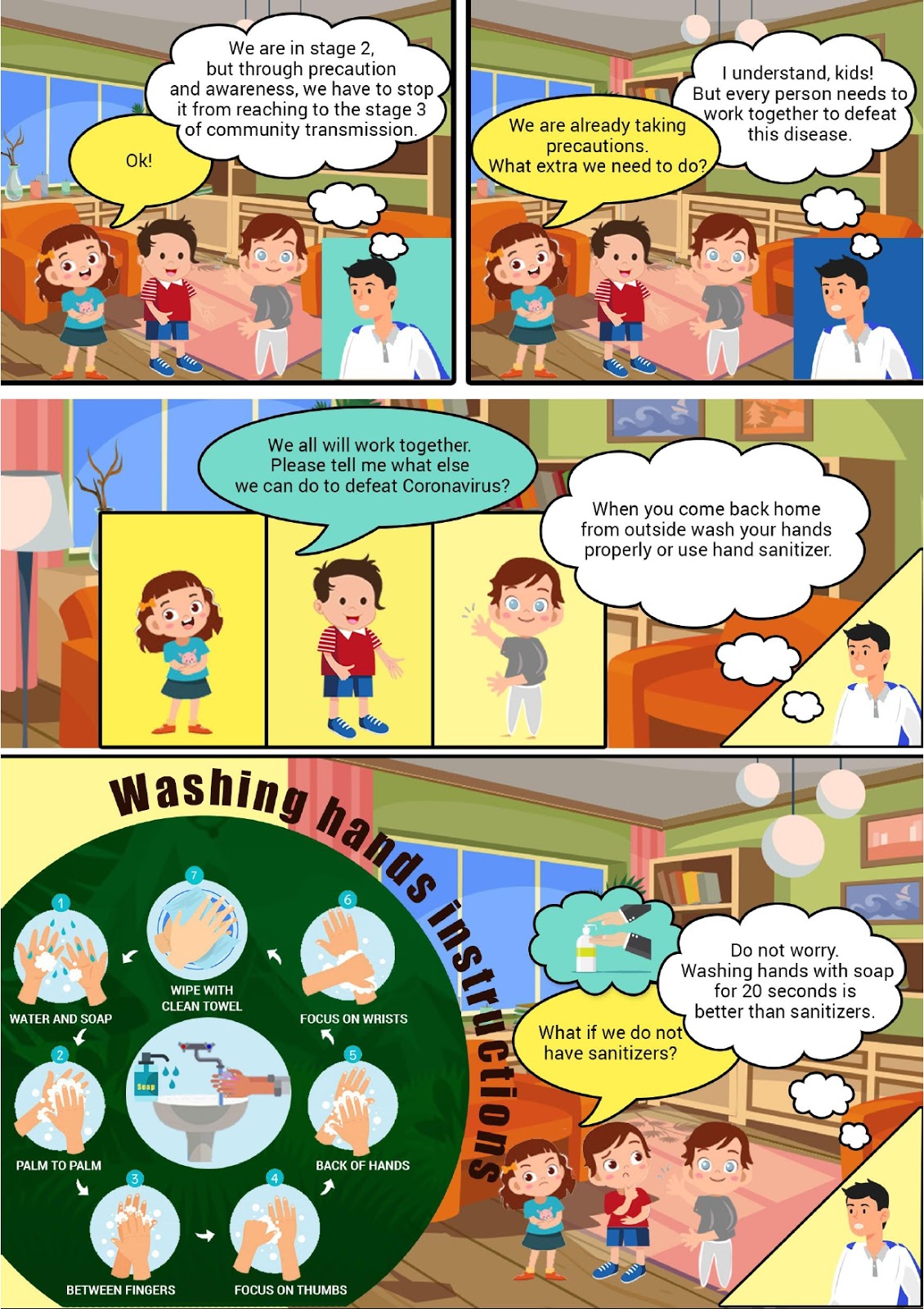 Sometimes parents might be busy and they might not be able to resolve their queries. Considering this PGIMER– Chandigarh, India and Panjab University- Chandigarh, India created this second part of the comic to make children aware about the threat of Corona- virus and clear some of the doubts and how to remain safe through simple precautionary steps. This comic is created to learn, along with fun and motivate children to be a hero of prevention by defeating corona and other infectious germs.